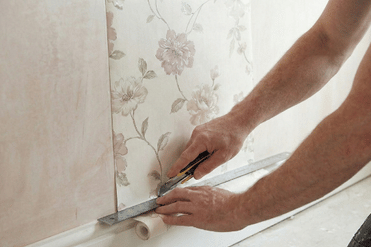After the wallpaper is smoothed onto the wall, the excess paper at the ceiling and skirting board is carefully trimmed away using a sharp utility knife and a straight edge. This creates clean, crisp edges and a professional finish.